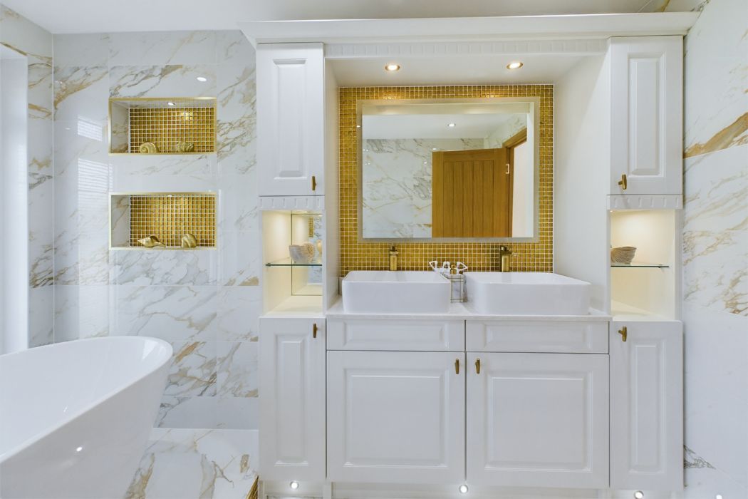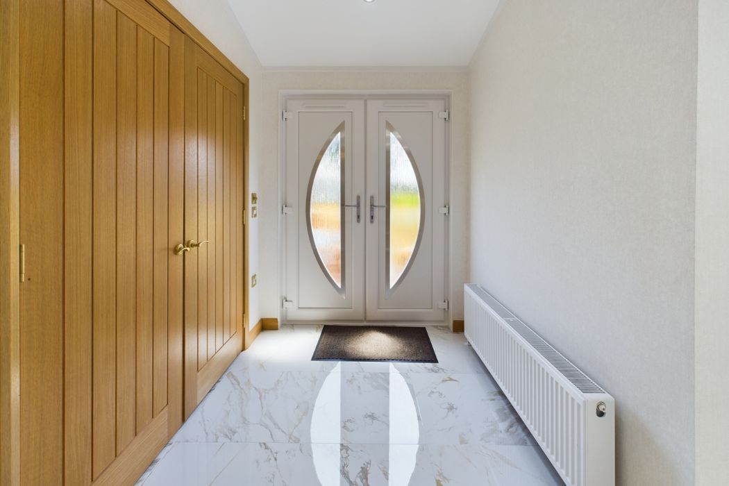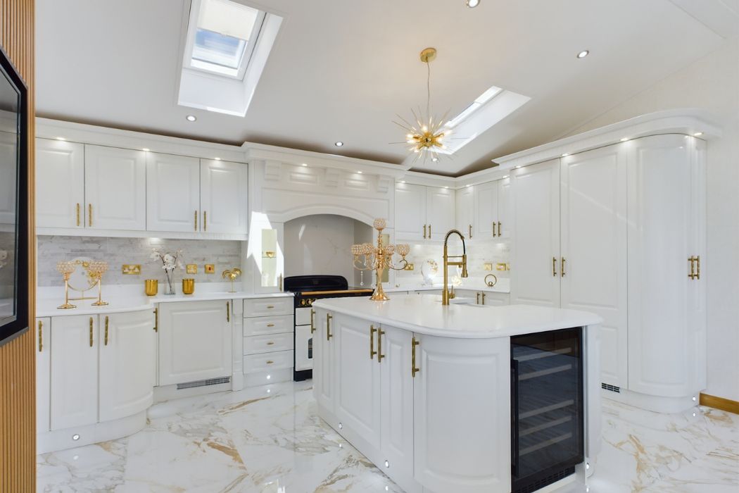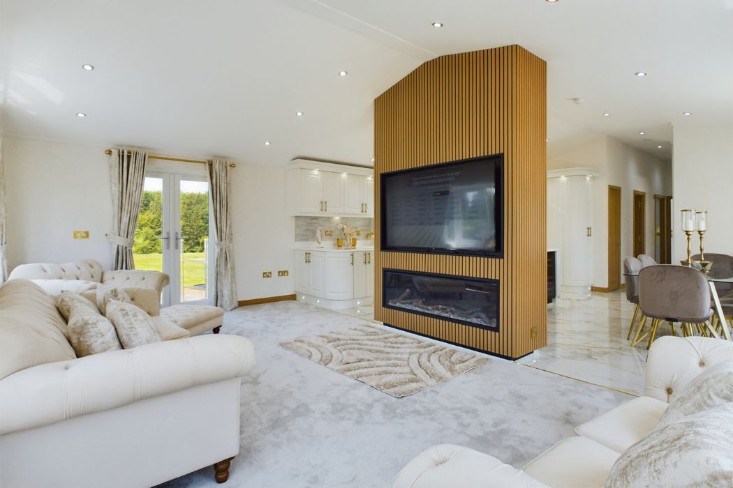 A grand double-door entrance hall welcomes you into an expansive open-plan living space. The culinary enthusiast’s kitchen is the heart of the home, featuring a range cooker, a practical island with a built-in wine cooler, a Belfast sink, and lavish quartz worktops. The adjoining lounge provides a stylish focal point with its feature media wall and integrated fireplace.