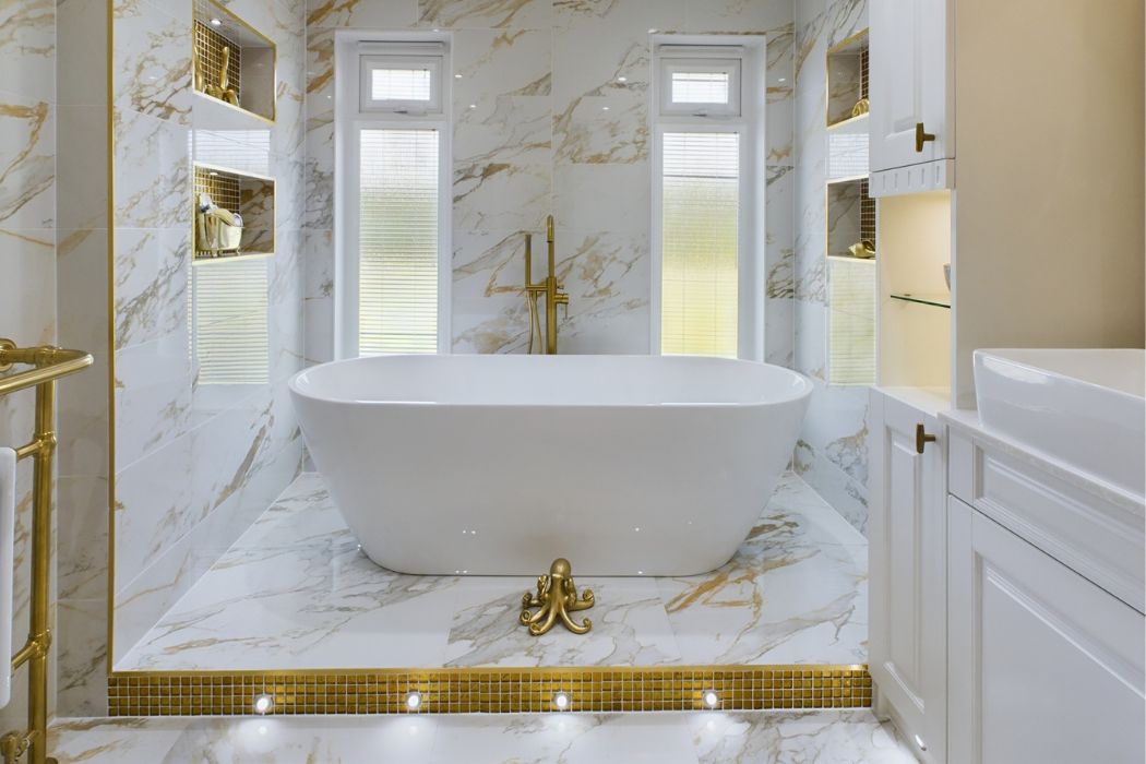 The master bedroom is a sanctuary of comfort, distinguished by large cathedral windows that flood the room with light. It includes a walk-in dressing area with innovative island storage and a private en-suite with a walk-in shower. The opulent, fully-tiled family bathroom completes the home, featuring a luxurious free-standing bath.